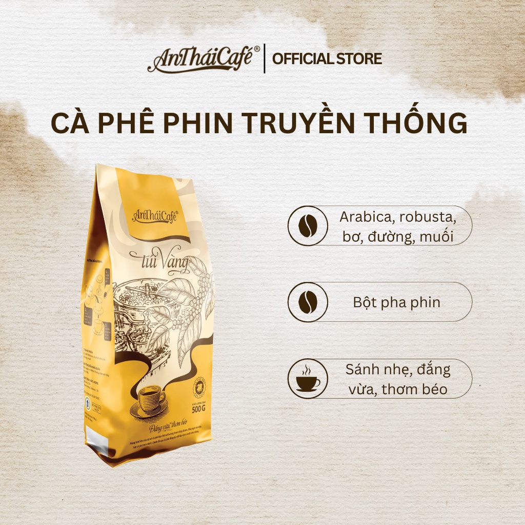 Với đặc thù của kênh quán, AnTháiCafé cho ra đời 4 sản phẩm chuyên dùng đó là: Túi Nâu, Túi Vàng, Túi Bạc, Túi Gold. Với nguyên liệu được tuyển chọn tỉ mỉ kỹ lưỡng từ những hạt cà phê no tròn đầy nắng gió Tây Nguyên, cùng công nghệ hiện tại từ châu Âu, dòng sản phẩm kênh quán được chuyên biệt với từng gu thưởng thức của khách hàng.